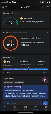 Zepp-appen är indelad i fyra avsnitt. Avsnittet "Start" innehåller en översikt över fält för beredskap, steg, sömn, Zepp Aura, hjärtfrekvens, PAI och träningshistorik. Om du klickar på ett fält kommer du till respektive undermeny. Ytterligare två avsnitt är avsedda för sömn och träning.