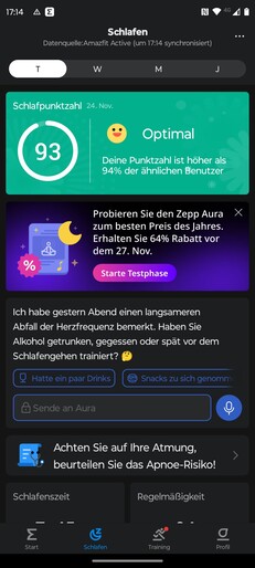 Amazfit lägger stor vikt vid sömnanalys, vilket framgår av en särskild flik i appen. Appen ger en övergripande sömnpoäng, visualiserad som ett poängvärde och representerad av ett cirkeldiagram och färg. Poängen kategoriseras ytterligare, till exempel att vara märkt som "bra".