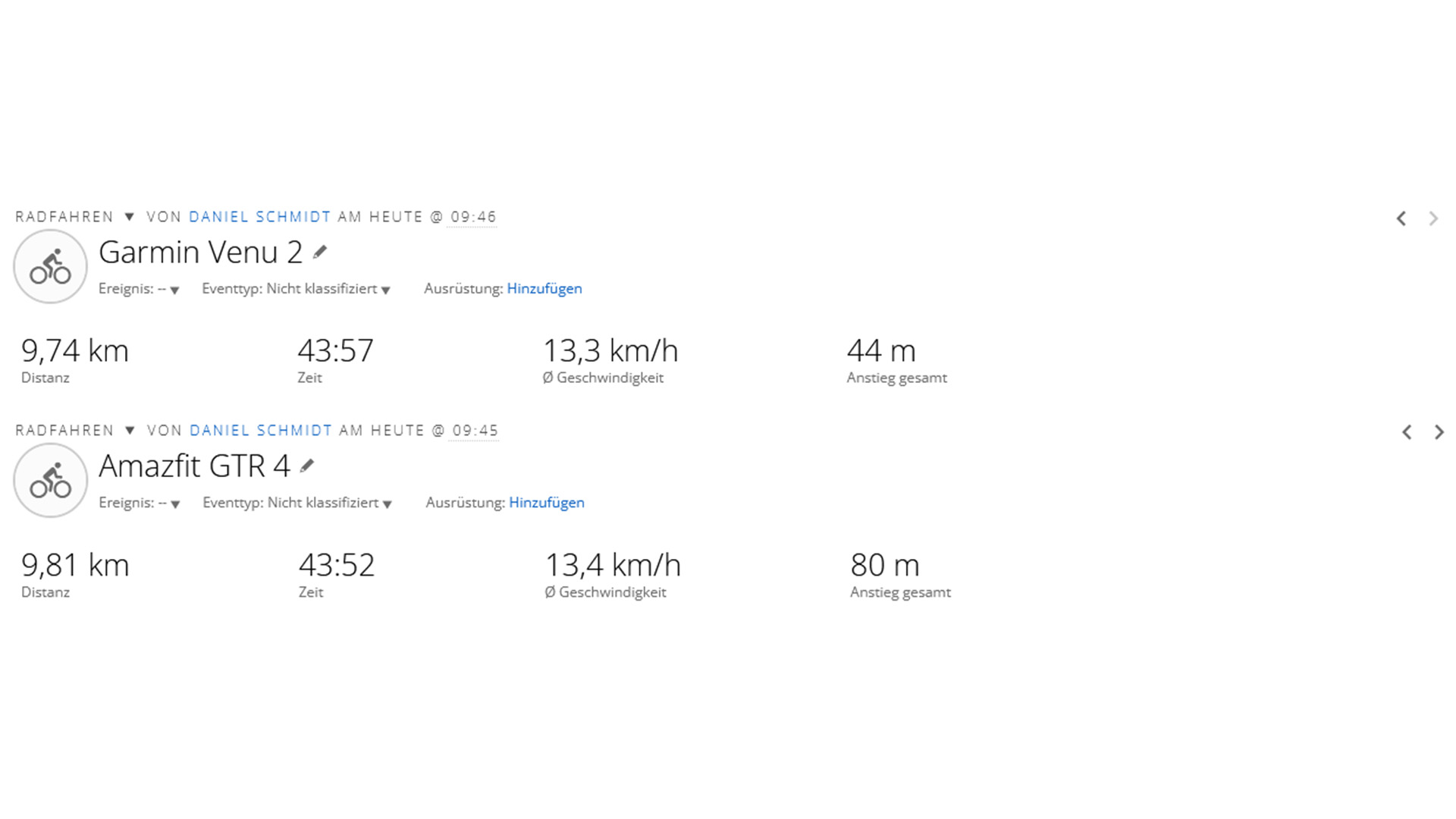 Värdena för Amazfit-smartklockan avviker dock avsevärt vid prestationshjärtfrekvens. Skillnaden är över 30 procent över tre mätningar. Vid ytterligare mätningar och jämförelser med andra smartklockor under andra träningspass var skillnaderna betydligt mindre. Detta tyder på ett fel i huvudmätningen, klockan kan ha halkat.