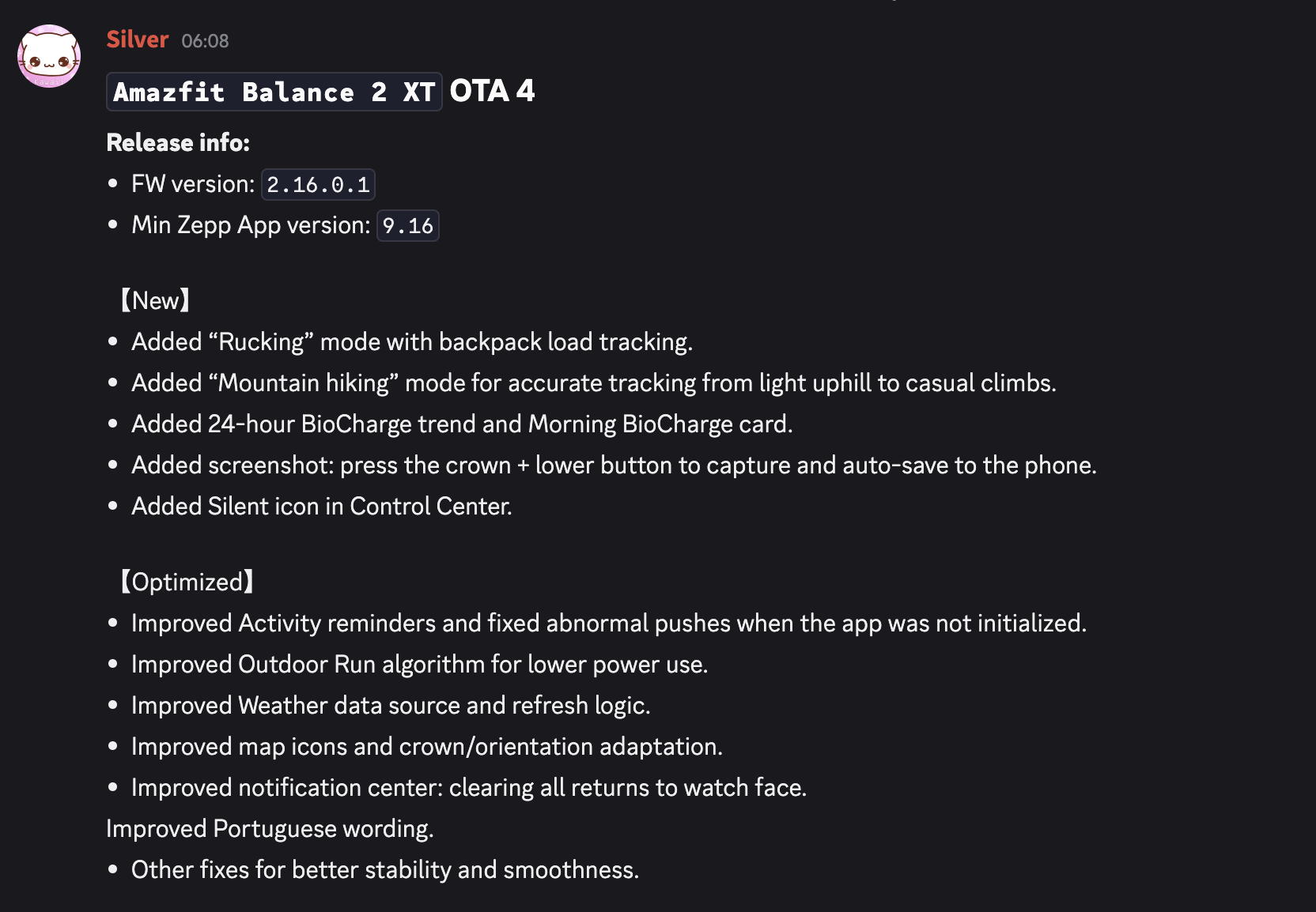 Tillkännagavs i Zepp Health Discordkallas den senaste uppdateringen Amazfit Balance 2 XT OTA 4 release, eller firmwareversion 2.16.0.1. Det ger en rad nya funktioner till denna smartwatch, inklusive två nya träningslägen: Rucking och Mountain Hiking. Det finns två verktyg relaterade till BioCharge-energiövervakning: en 24-timmars BioCharge-trend och ett Morning BioCharge-kort.