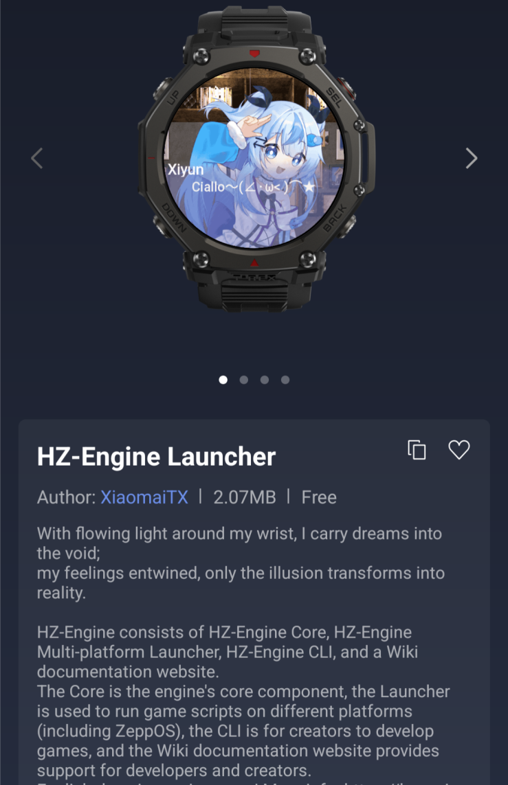 Den mest populära nya appen, enligt Zepp OS Weekly Top 50 Downloaded Apps chart, är HZ-Engine Launcher. Startprogrammet kan användas för att köra spelskript för Visual Novel Engine på Zepp OS. Andra populära nytillskott är Telegram-klienten tgwatch och CaferoChat, som beskrivs som en "minimalistisk chattapp för smartklockor".