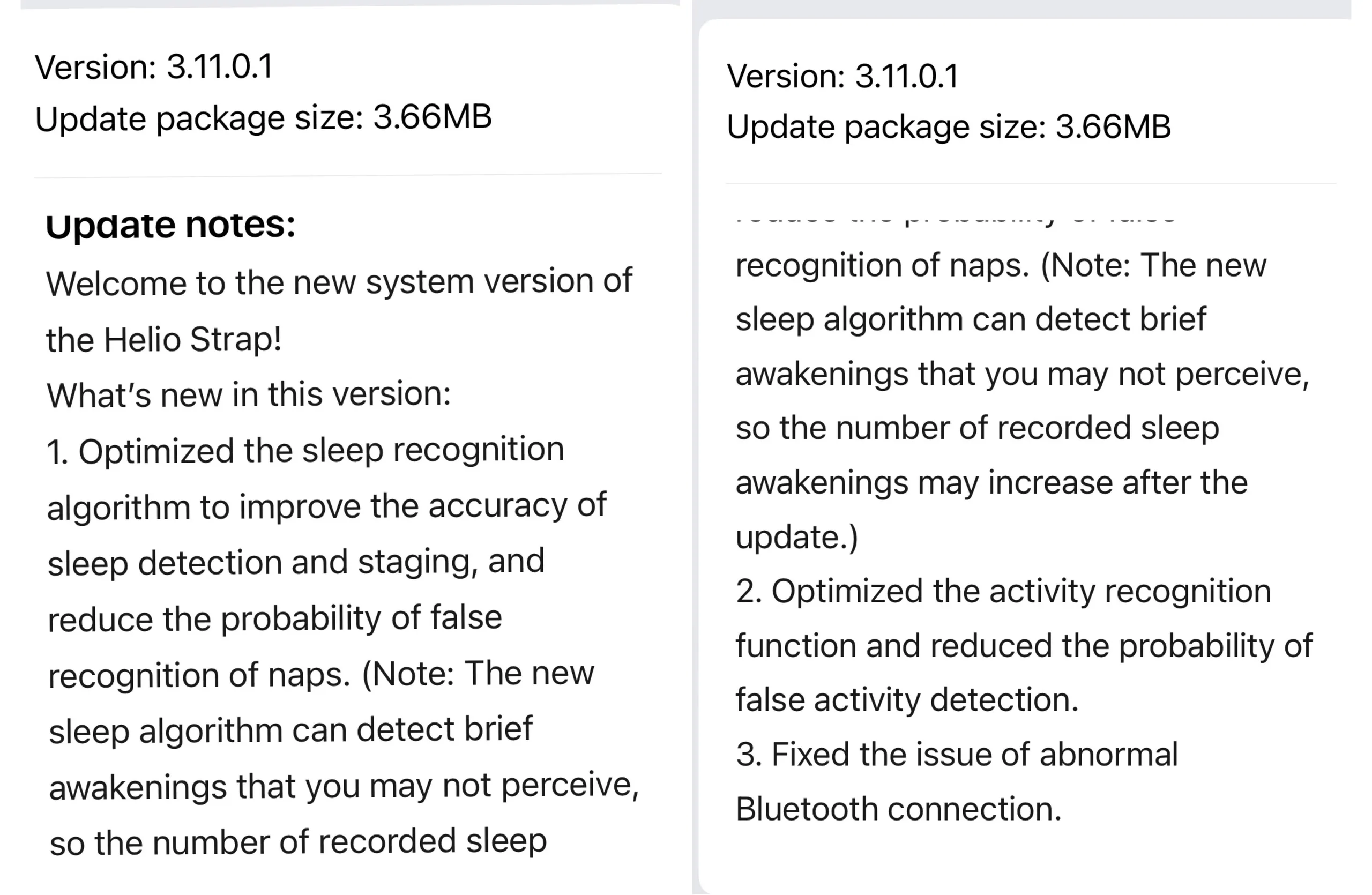 Med firmwareversion 3.11.0.1, rapporterade på Redditfår användare av Amazfit Helio Strap två förbättringar. För det första sägs sömnigenkänningsalgoritmen ha optimerats för ökad sömndetektering och noggrannhet i sömnstadiet. Amazfit noterar dock att det totala antalet perioder av uppvaknande kan öka som ett resultat av denna förändring. Samtidigt har risken för att en tupplur registreras felaktigt minskat.