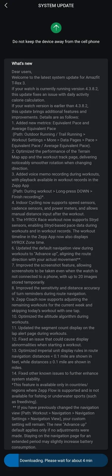 Ändringsloggen, delad på Amazfit T-Rex 3/3 Pro Facebook Groupsäger att det finns två nya mätvärden för Outdoor Running och Trail Running aktiviteter: Ekvivalent Pace och Genomsnittlig ekvivalent Pace. Andra träningsspecifika tillägg är stöd för hastighetssensorer, kadenssensorer och effektmätare för inomhuscykling och stöd för Stryd-sensorer för HYROX Race.