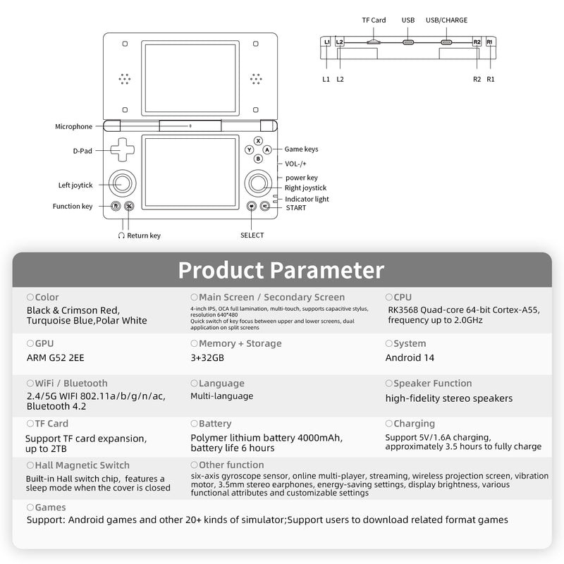 Anbernic kompletterar denna blygsamma SoC med 3 GB RAM, sannolikt LPDDR4 eller LPDDR4X, 32 GB utbyggbart lagringsutrymme och ett batteri på 4 000 mAh som klarar upp till 6 timmars spelande mellan laddningarna. Dessutom har spelhanddatorn stöd för Bluetooth 4.2 och Wi-Fi 5-anslutning med Android 14 förinstallerat.
