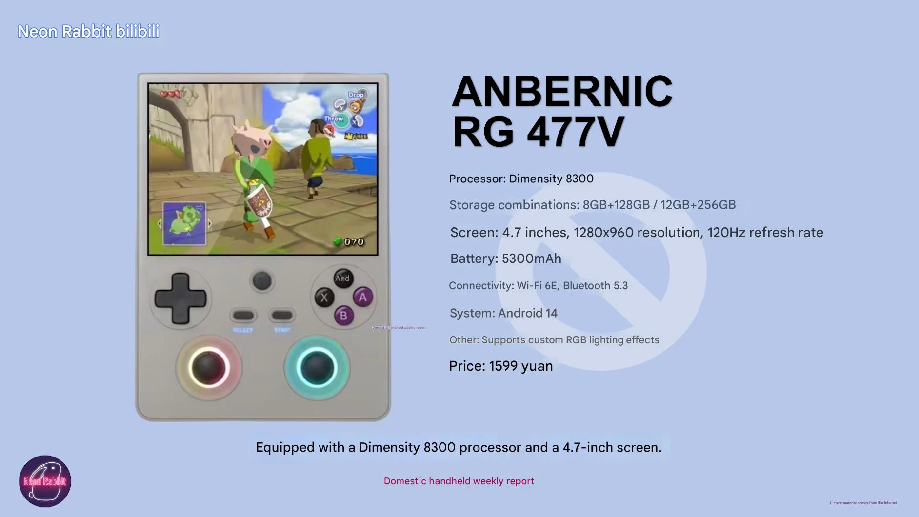 Enligt läckan Neon Rabbit förbereder Anbernic nu ett nytt alternativ till den befintliga RG406V. På Bilibili hävdar kontot att Anbernic har skapat RG477V från inälvorna av den befintliga RG477M. Som sådan sägs RG477V innehålla en MediaTek Dimensity 8300 chipset och en 4,7-tums IPS-skärm. Båda är uppgraderingar jämfört med hårdvaran som finns i RG406VrG477V kommer att använda sitt betydligt snabbare chipset med en 960p-upplösning och en 120 Hz uppdateringsfrekvens som kan användas för Black Frame Insertion (BFI) för att förbättra CRT-effekter.
