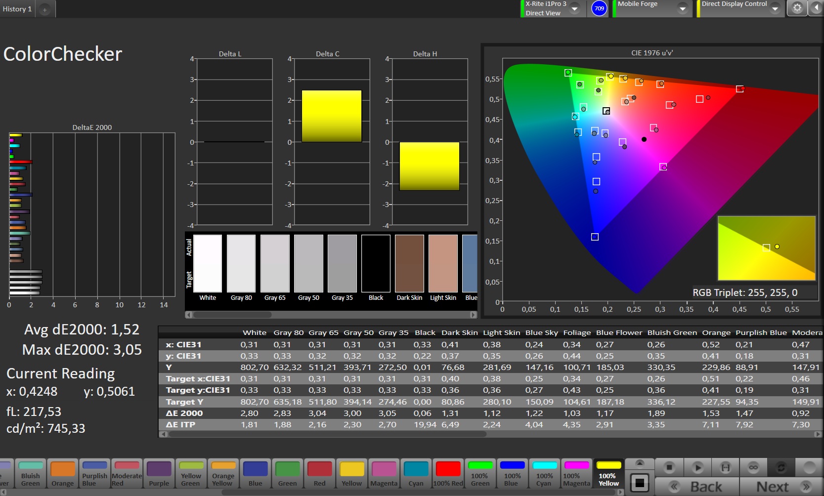 | Colorchecker dE 2000 * | 1.52 | 1.1 28% | 3.5 -130% | 1.3 14% | 1 34% |