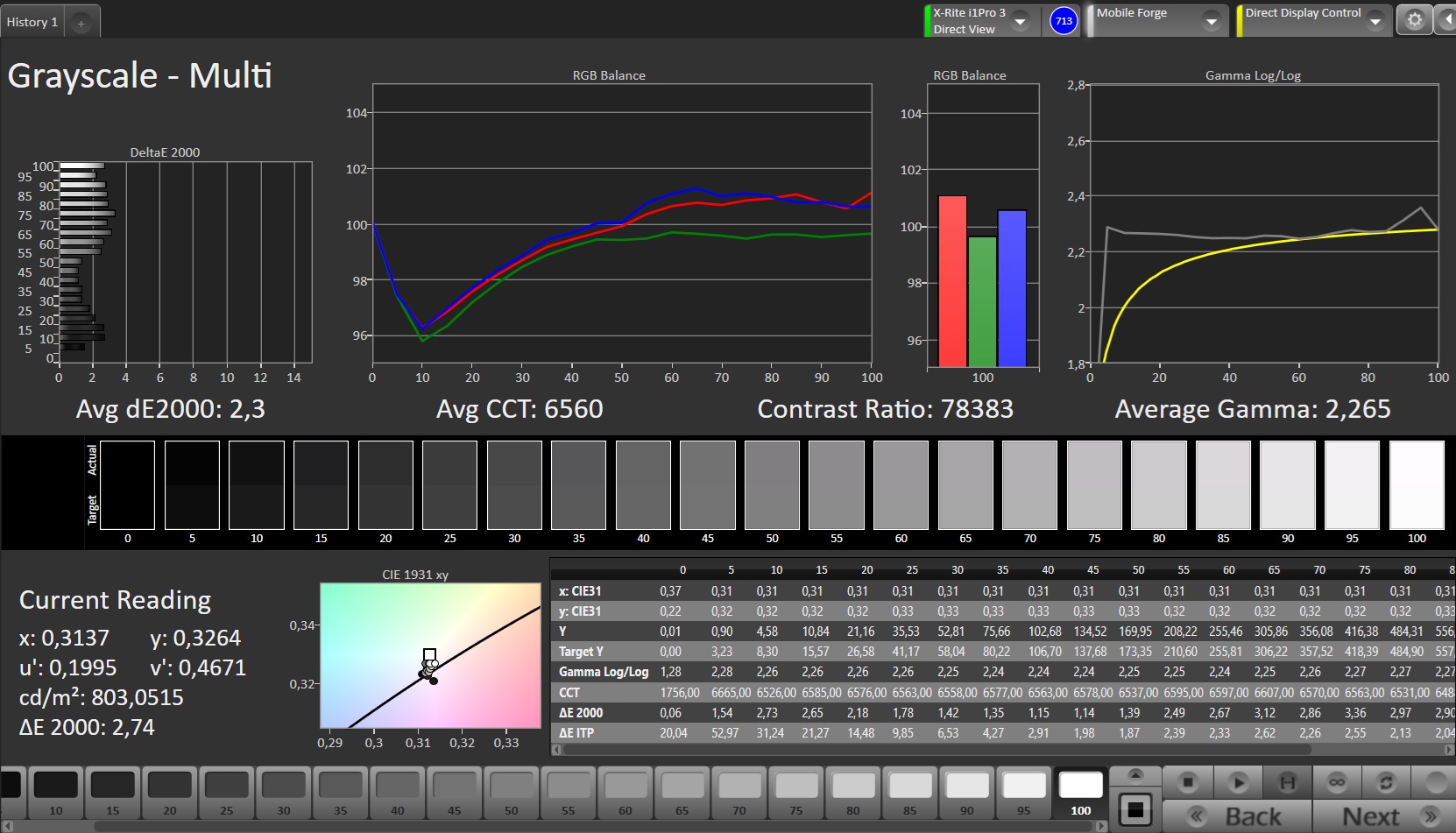 Färgkalibreringen av skärmen utvärderades med hjälp av Calman analysprogramvara och en fotospektrometer, och visade endast mindre avvikelser från referensvärdena.