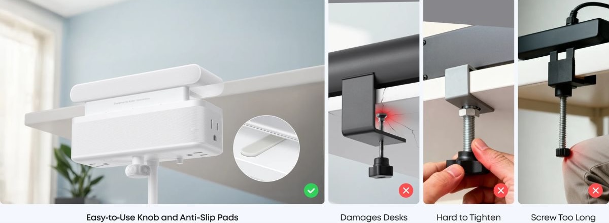Ankers Nano Power Strip har en justerbar klämdesign, med de två halvorna säkrade över och under skrivbordet med en integrerad knopp. Enligt företaget håller detta system enheten säkert på plats, vilket gör det möjligt för användarna att ansluta eller koppla ur enheter med en hand utan att den rör sig. Den är utformad för att passa skrivbord som är 0,6 till 1,8 tum (~12 till 45 mm) tjocka, och denna GaN-laddare mäter 153 x 52,2 x 100,85 mm (6,02 x 2,06 x 3,97 tum).