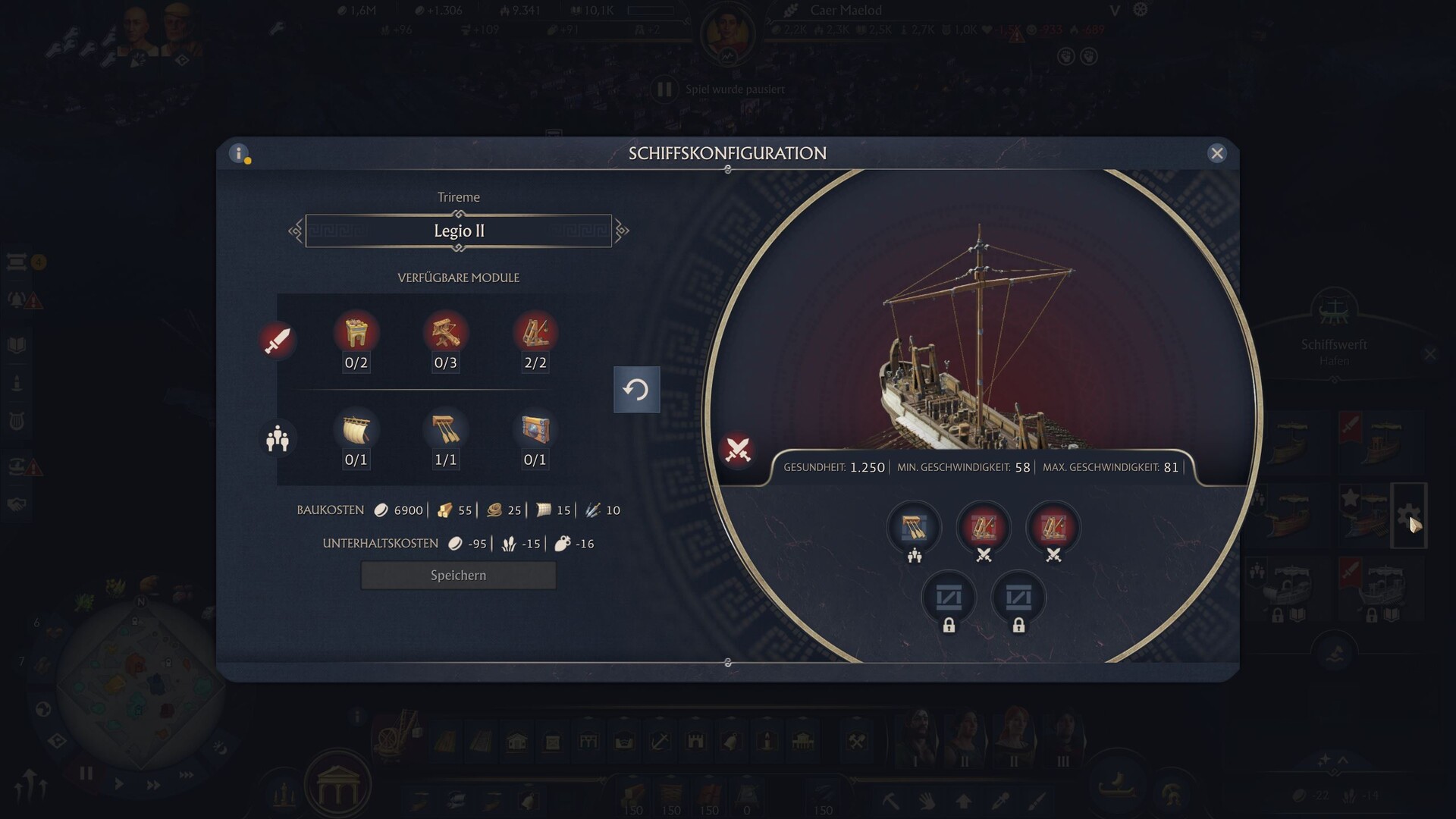 Sjöstrid drar nytta av den modulära designen av fartyg. Beroende på fartyg kan flera moduler fästas för att göra dem mer effektiva mot byggnader, till exempel. Under vår granskning kunde vi eliminera en av de svagare piraterna och en annan AI-prätor via landstrid. Hans starkare piratbror i Latium gick med på vapenvila efter kostsamma strider, men till kejsarens missnöje. Våra handlingar påverkar inte bara relationerna med andra härskare utan också vår ställning hos kejsaren, vilket i värsta fall kan leda till krig.