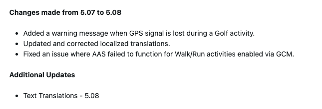Programvaruversionen 5.08 innebär tre förändringar för Lily 2 Active smartwatch. För det första får användarna ett nytt meddelande när GPS-signalen försvinner, även om detta bara inträffar under en golfaktivitet. Garmin har också tagit itu med ett problem kopplat till smartklockans Auto Activity Start-funktion. Detta verktyg gör att tidsbestämda aktiviteter kan skapas och sparas automatiskt. En bugg som innebar att det inte fungerade tillförlitligt för gång- och löpträningspass när det aktiverades via Garmin Connect Mobile-appen har lösts.