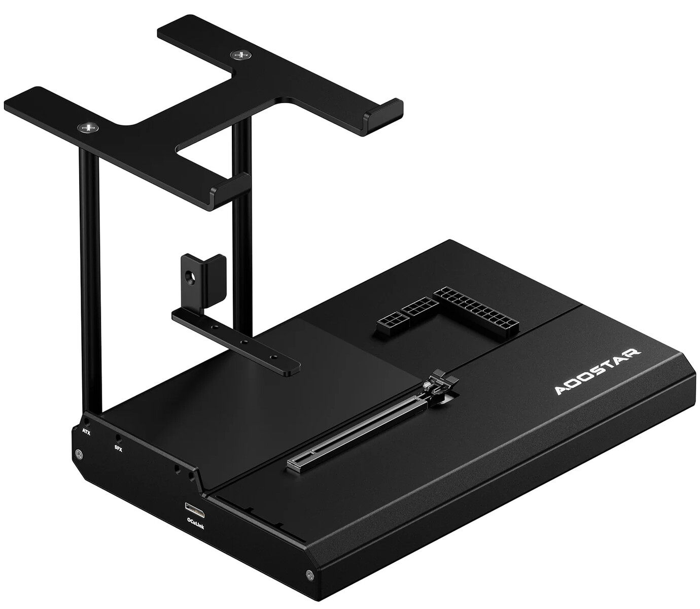 Uppenbarligen liknar EG01 en Minisforum DEG1 men med ett fäste för förvaring av en mini-PC. Som bilden nedan visar är fästet löstagbart men måste skruvas fast med tre skruvar som fästs under EG01:s bottenplatta. Med andra ord är denna monteringslösning något mer permanent än GPU-fästet som fästs på en ATX- eller SFX PSU.