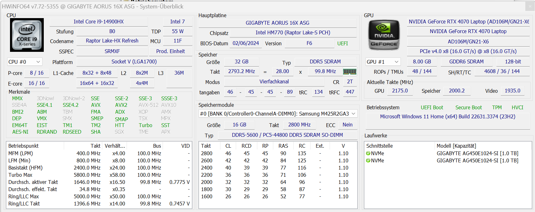 Aorus 16X är optimerad för spel, streaming och rendering i QHD+. Den Core i9-14900HX och GeForce RTX 4070 levererar den prestanda som krävs. CPU och grafikkärna arbetar med genomgående höga klockfrekvenser. Två snabba PCIe-4 SSD-enheter (1 TB vardera) säkerställer korta laddningstider.