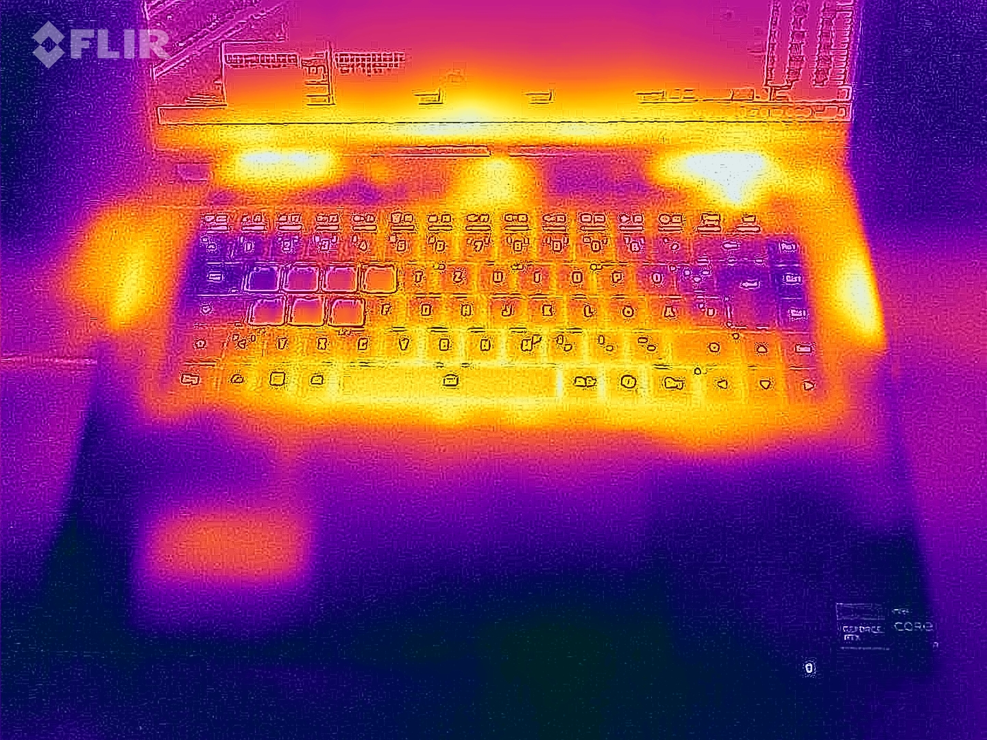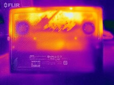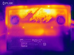 Stresstestet och Witcher 3 test fick bara den bärbara datorn att värmas upp lite. I vissa fall uppmätte vi värden i det lägre till mellersta 40-graders Celsius-intervallet. Vid daglig användning (kontor, internet) kommer värdena i stort sett att ligga kvar i den gröna zonen, men de är över genomsnittet.