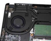 När du har tagit bort alla skruvar på undersidan av enheten kan du använda en platt spatel eller plektrum för att ta bort den nedre delen av höljet. Därefter kan du komma åt minnesbankerna (båda upptagna), båda SSD-enheterna (PCIe 4, M.2-2280), WLAN-modulen, fläktarna, BIOS-batteriet samt det vanliga batteriet.