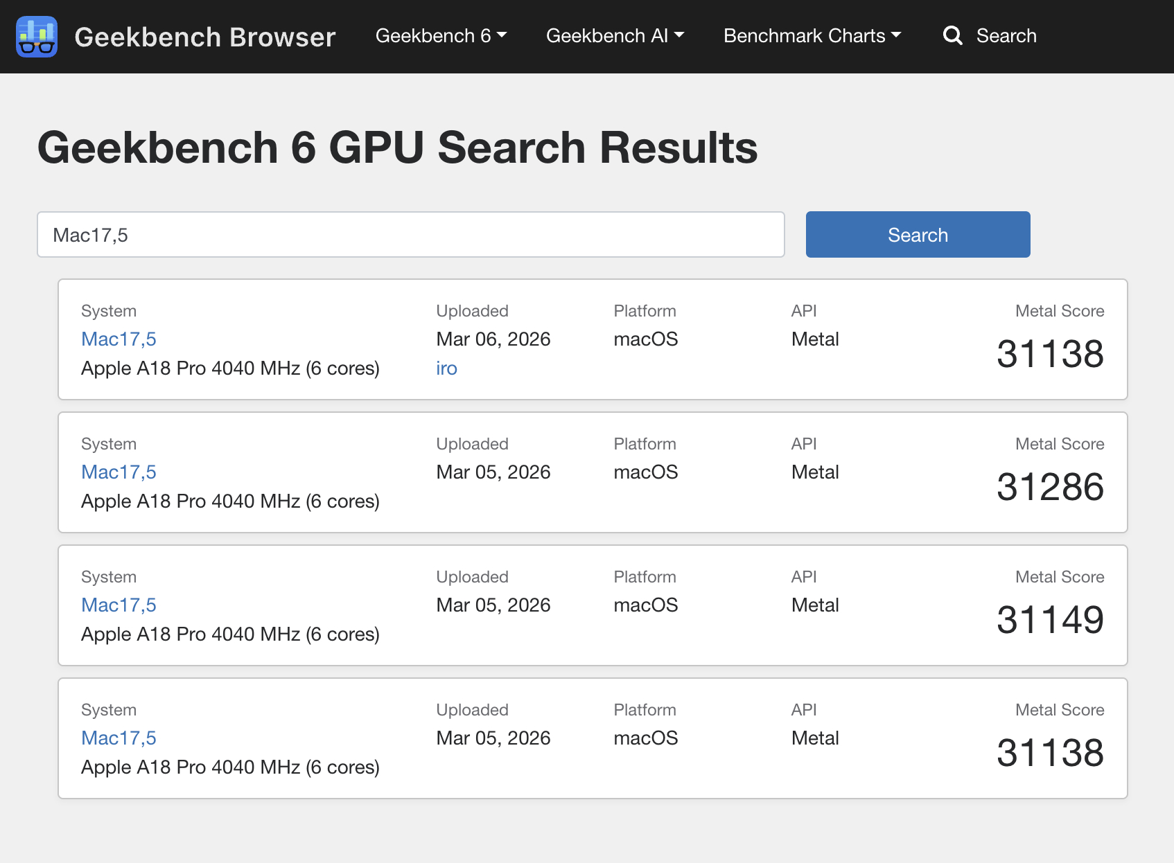 Å ena sidan verkar GPU-prestandan ligga något före den M1-drivna MacBook Air som vi granskade 2020. Vid den tiden hade den enheten ett genomsnitt på 30 112 i Geekbench 6.5 Metal-riktmärket. Under tiden returnerar MacBook Neo 31,178 från de riktmärken som hittills har listats. Det resultatet kommer upp cirka 5,7% kortare än iPhone 16 Pro Max trots att den innehåller 16,6% färre GPU-kärnor.