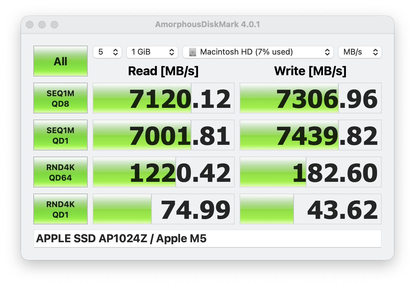 Apple har återigen ökat prestandan avsevärt med sin nya M5 SoC, som för närvarande är den överlägset snabbaste enkärniga processorn som finns på marknaden. Förbättringarna i dess flerkärniga och grafiska prestanda jämfört med den gamla M4 SoC är nu ännu större. Dessutom har SSD-enheternas hastighet ökats till PCIe 4.0-nivåer.