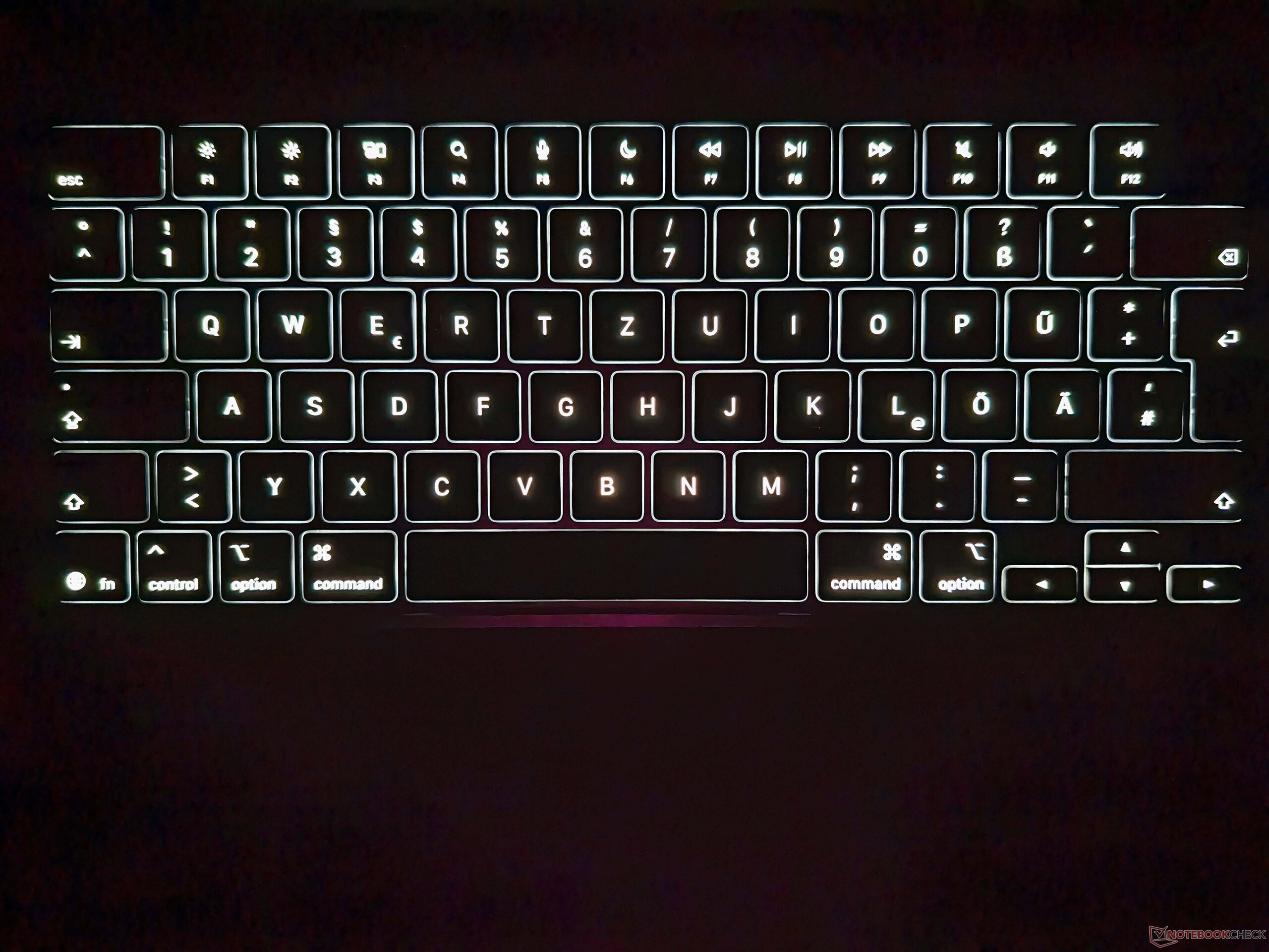 Apple fortsätter att förlita sig på den välkända Mini LED-panelen. Köpare kan också välja en matt version (+150 $), som vi hade tillgänglig för oss under vårt test. Bildkvaliteten försämras minimalt på grund av den matta ytan och färgerna är inte riktigt lika briljanta, men i gengäld kan du arbeta i ljusa miljöer utan att behöva kämpa med irriterande reflektioner. Mini LED-bakgrundsbelysningen flimrar konstant med en mycket hög frekvens på strax under 15 kHz, så det bör inte vara några problem för känsliga användare. På grund av detta flimmer kunde vi tyvärr inte exakt fastställa skärmens svarstider, så våra mätresultat har endast begränsad betydelse. Tillsammans med uppdateringsfrekvensen på 120 Hz finns det inga som helst problem med synliga spökbilder.