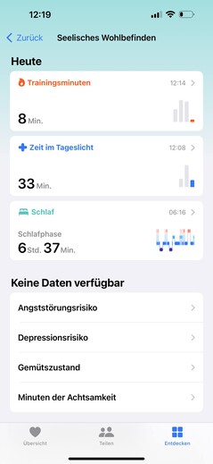 Programvaran genererar medelvärden för enskilda veckor och visar trender, t.ex. omgivande ljudnivåer, trappklättring eller aktivitetsenergi. Som komplement till Health-appen erbjuder Apple Fitness-appen, som visar aktiviteter, utmärkelser, aktivitetstrender och en träningsöversikt.