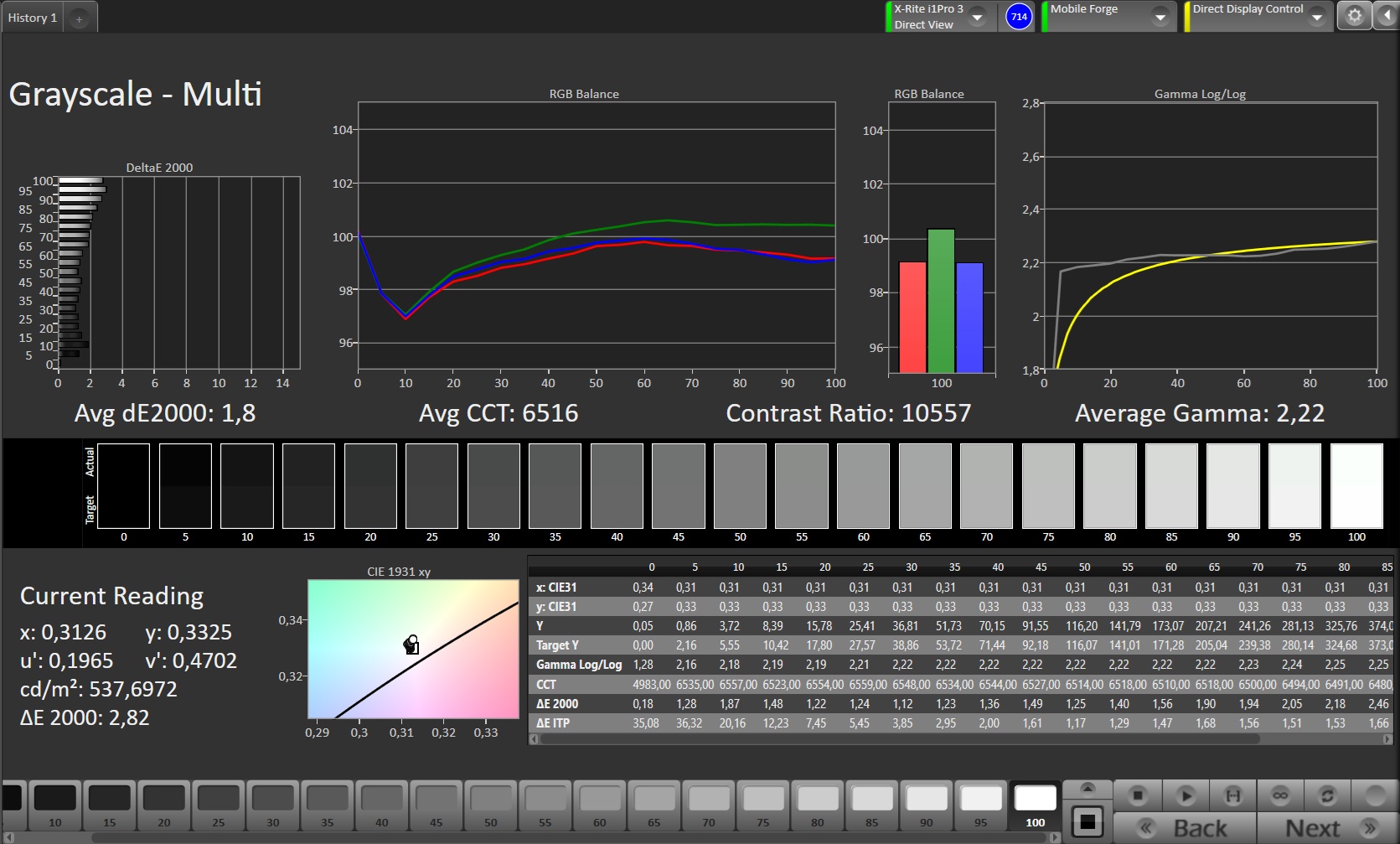 Apple har också justerat ljusstyrkan. Istället för det tidigare maxvärdet på 2000 cd/m² kan skärmen nu nå upp till 3000 cd/m² under korta perioder utomhus. Precis som tidigare anger Apple den genomsnittliga ljusstyrkan till 1000 cd/m² och det maximala HDR-värdet till 1600 cd/m². Med mindre, ljusstarka bildsektioner (APL18) kan vi dock uppnå ljusstyrkor på upp till 1587 cd/m², även med SDR-innehåll.