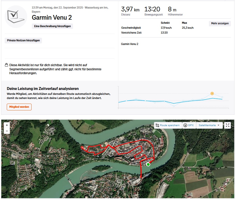 IPhone 17 använder satellitnavigeringstjänsterna GPS, GLONASS, Galileo, QZSS, BeiDou och NavIC i dualband för att bestämma sin position. Som vår korta cykeltur visar är smartphonen därför mycket lämplig för navigering. I jämförelse med Garmin Venu 2 fitness smartwatch har iPhone 17 mindre felaktigheter på vissa delar av rutten, men dessa är försumbara överlag.