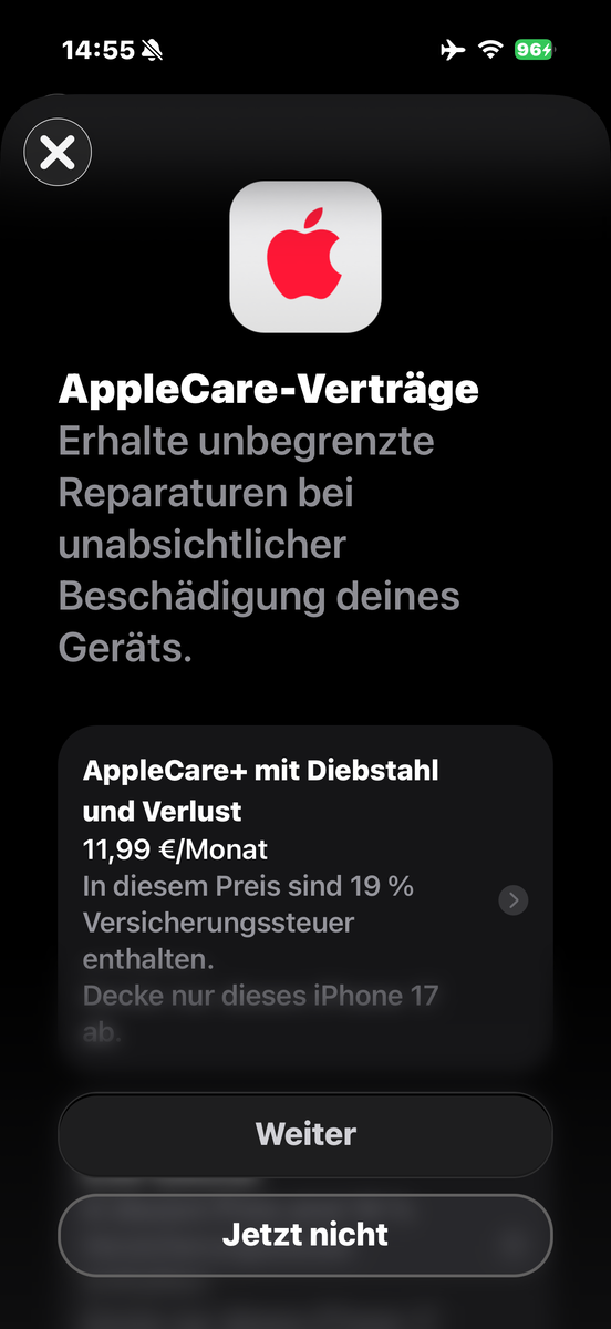IPhone 17 levereras med 12 månaders garanti från Apple. Den kan förlängas med AppleCare+som täcker reparationer i händelse av oavsiktlig skada (med förbehåll för en självrisk). Stöld eller förlust kan också täckas som tillval.