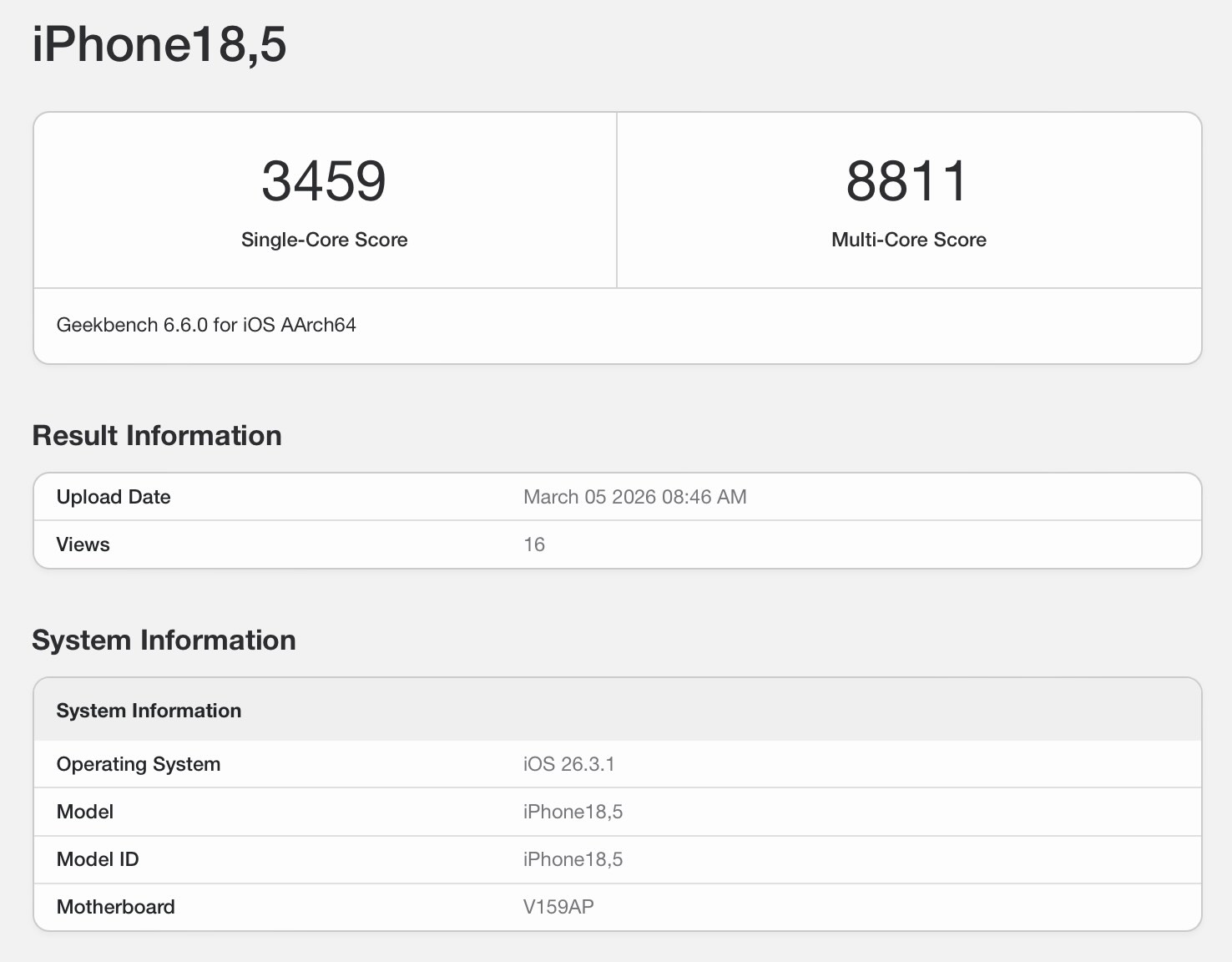 De läckta Geekbench-resultaten berättar också en liknande historia - iPhone 17e får 3 459 respektive 8 811 poäng i single- och multicore-tester. Som referens får standard iPhone 17 3 627 och 9 249 poäng i samma tester, vilket gör att skillnaden i rå prestanda mellan de två smartphones bara är cirka 4-5%.