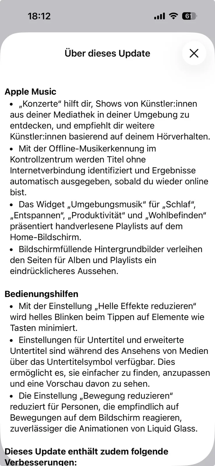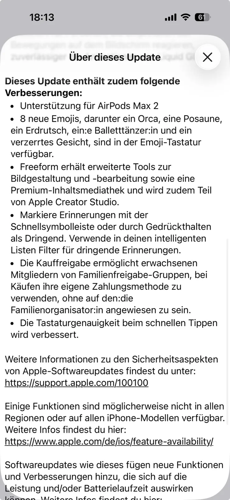 Musik-appen får helskärmsbakgrunder för album och spellistor och en "Concerts"-funktion som kan visa liveframträdanden av dina favoritartister i närheten. Nya tillgänglighetsalternativ gör att du kan minska Liquid Glass-animationer och ljusa element på skärmen. Apple introducerar också stöd för de nya AirPods Max 2 och åtta nya emoji. Apple freeform-appen får premiuminnehåll som kräver Apple:s Creator Studio-prenumeration. Särskilt spännande för många användare: uppdateringen åtgärdar en välkänd bugg som ofta orsakade att tangentbordet inte kände igen inmatningar korrekt när man skrev särskilt snabbt
