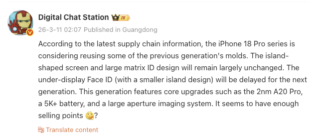 Den senaste informationen kommer återigen från Digital Chat Station som hävdar att Apple återanvänder formarna från föregående generation (iPhone 17 Pro) för att tillverka iPhone 18 Pro. Detta innebär att Dynamic Island kommer att vara "i stort sett oförändrad" som läckan nämner. Tyvärr för de som hoppas på en minskning av storleken på pillret, kommer både storleken och formen att förbli densamma.