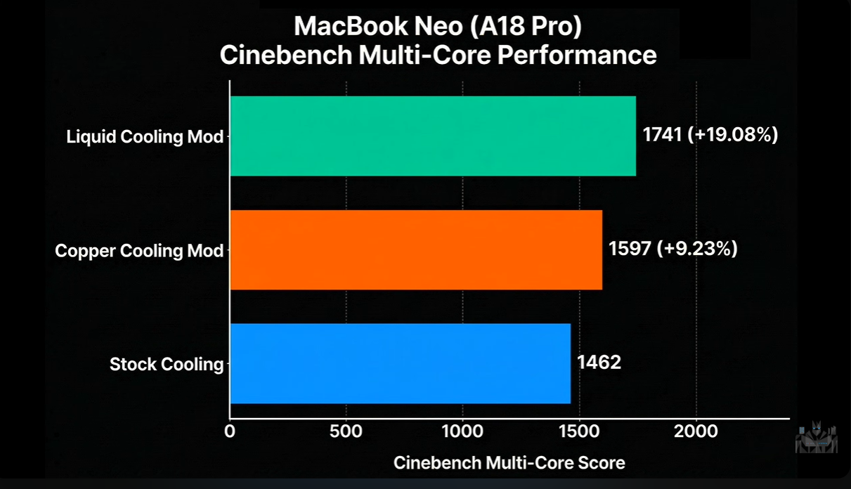 ETA Prime testade också en termoelektrisk vattenkylare för att se hur mycket bättre MacBook Neo kan prestera. Den termoelektriska kylaren sänkte Apple A18 Pro:s drifttemperatur till mellan 70 C i No Man's Sky, med FPS knappt under 60. I Geekbench 6.6 körde MacBook Neo ännu snabbare, med totala prestandavinster för enkärniga och flerkärniga enheter på 17,5 % respektive 18,6 %.