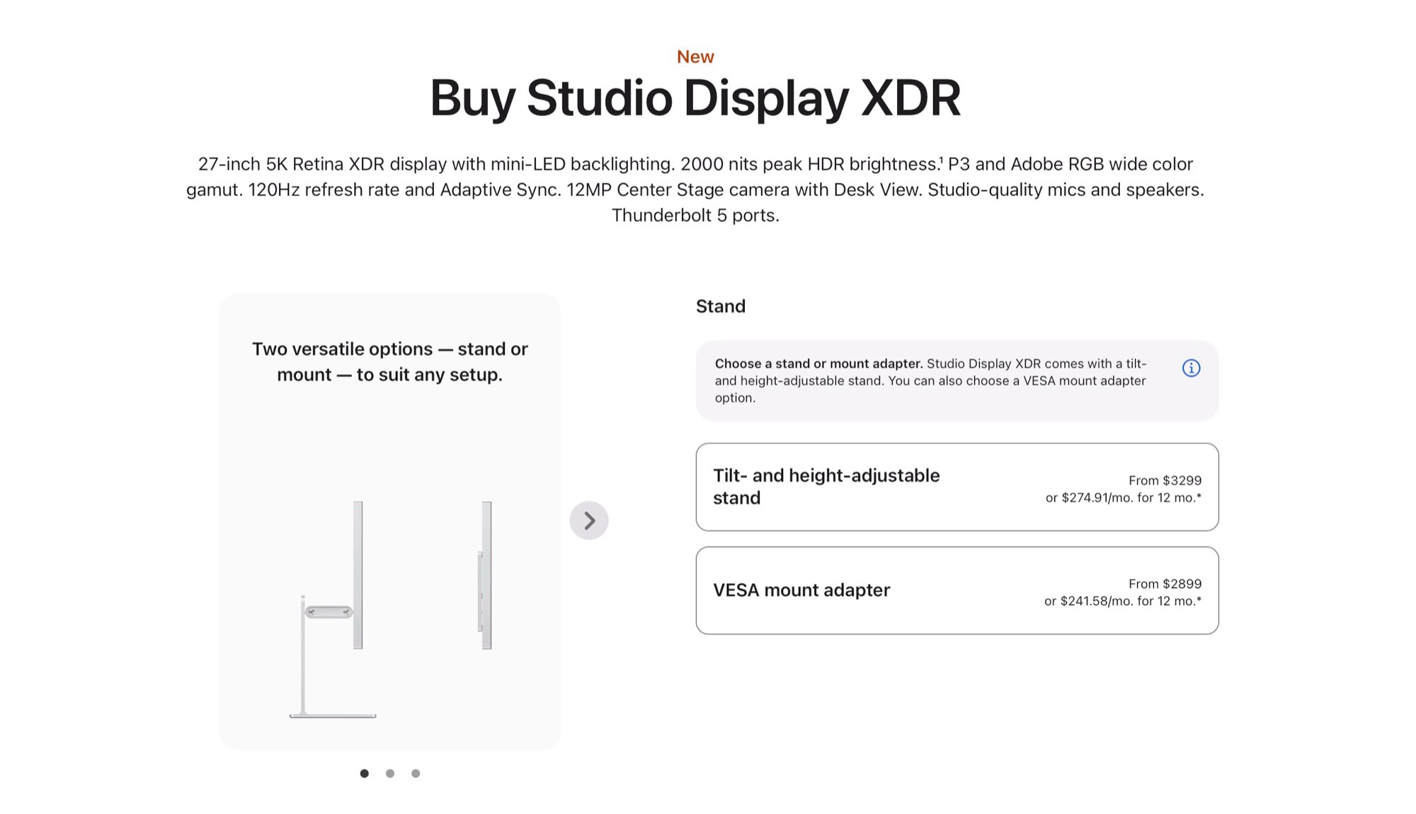 Apple Studio Display XDR($3,299 på Amazon) lanserades i början av mars för ett rekommenderat försäljningspris på $3,299 euro på marknaden. Detta pris gällde tidigare oavsett om monitorn köptes med Apple:s höjdjusterbara stativ eller med en VESA-adapter för stativ och monitorarmar från tredjepartsleverantörer.