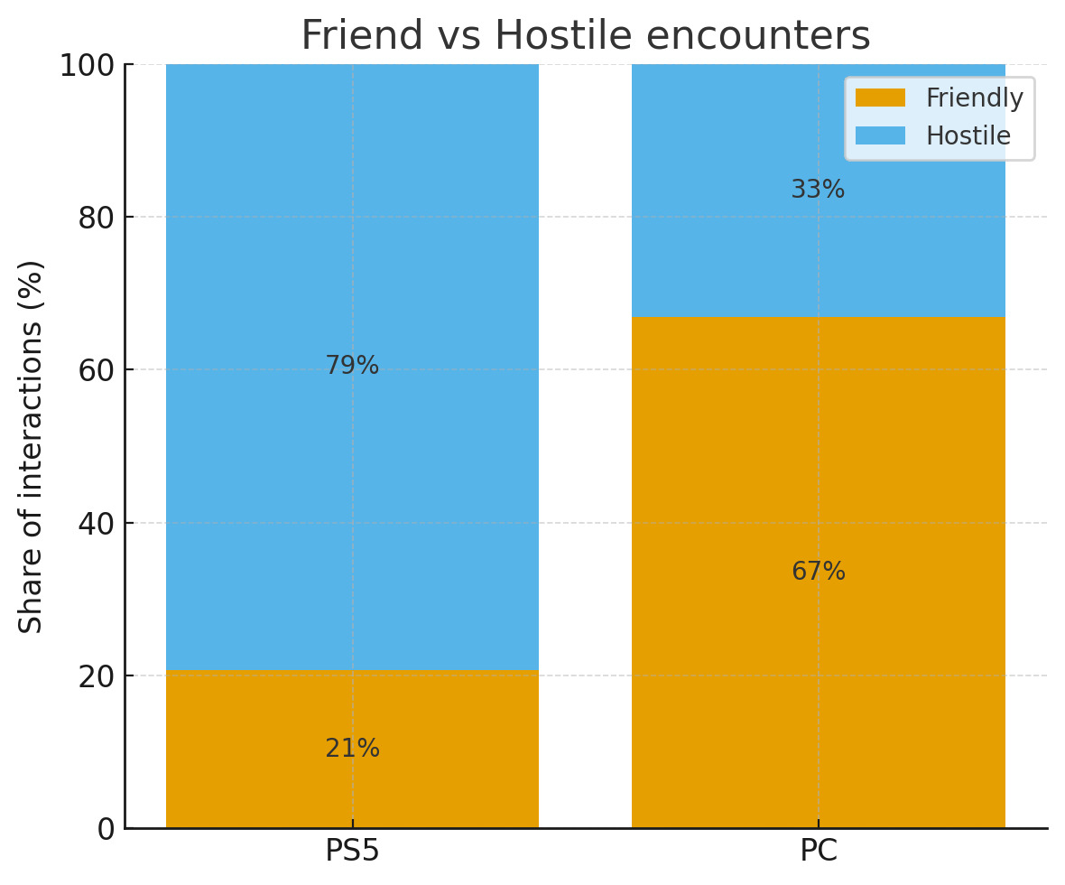 Diagrammen sammanställdes (se nedan) från deras data (tack till u/Scared-Computer502) gör den kontrasten ännu tydligare. I ett nötskal visade PC-spelare en högre andel vänliga eller samarbetsvilliga handlingar, medan PS5-möten resulterade i mer backstabs och omedelbar fientlighet. Observera att urvalsstorleken fortfarande är liten och begränsad till bara två spelare och en veckas spel, men klyftan mellan de två upplevelserna var tillräckligt stor för att båda tyckte att det var värt att dela. För dessa två spelare (åtminstone) kändes Arc Raiders som två olika spel beroende på var de spelade.