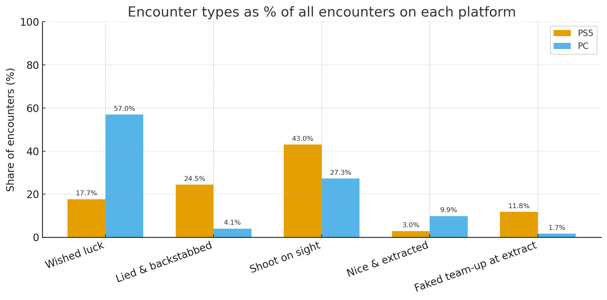 PS5-spelaren körde 84 omgångar och träffade 237 spelare. En stor del av dessa möten var fientliga. Av alla spelare han träffade sköt 102 på sikte. Ytterligare 58 låtsades samarbeta innan de landade en backstab. Vänliga interaktioner fanns där, men ganska begränsade - bara 42 önskade honom lycka till och 7 höll ihop tillräckligt länge för att extrahera som ett lag. Även försök till korta team-ups slutade ofta illa, med 28 spelare som fejkade samarbete innan de blev fientliga i extraktionszonen.