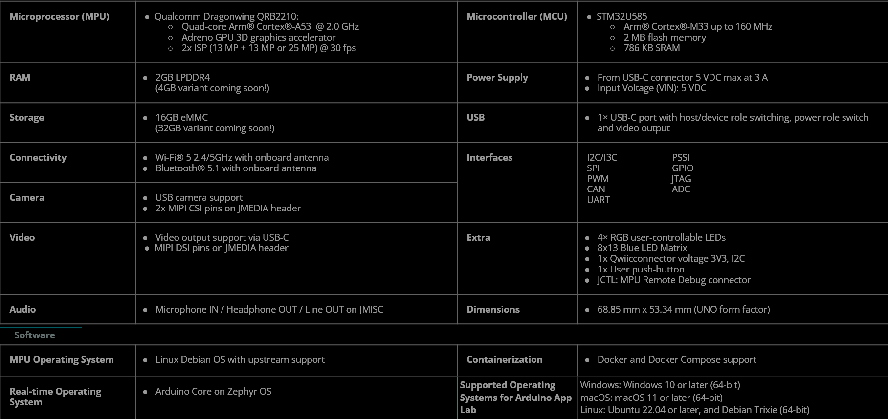 På mjukvarufronten kör Arduino UNO Q Zephyr OS och har gränssnitt mot sin Memory Protection Unit via Debian. Företaget har också presenterat sin nya programvara Arduino App Lab som körs på alla populära operativsystem. Pris och tillgänglighet kommer att meddelas vid ett senare tillfälle.