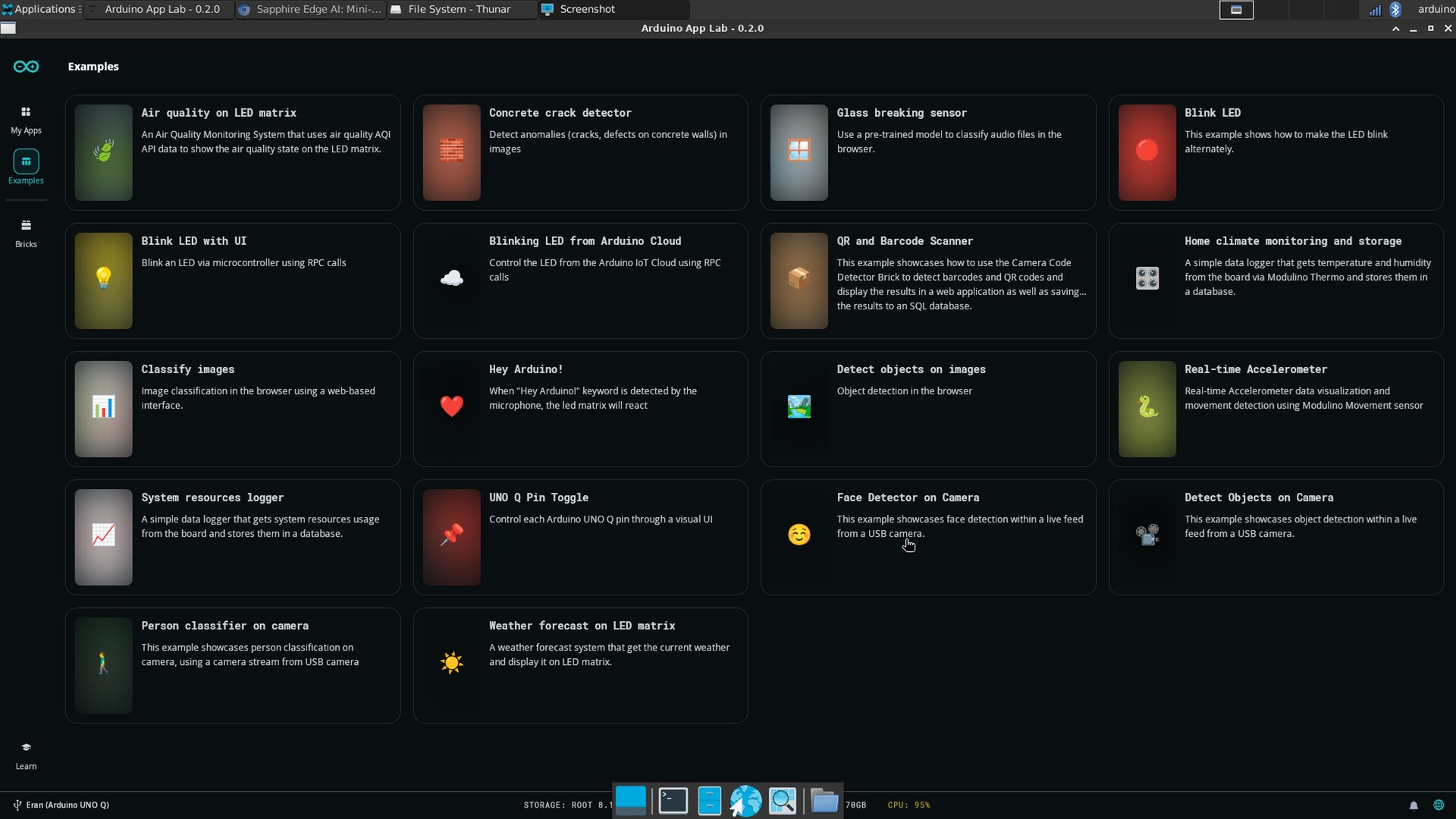 Exemplen från Arduino App Lab är också värda att nämna. De introducerar användarna till det blockbaserade https://docs.arduino.cc/software/app-lab/tutorials/bricks/ arbetsflödet och gör det enkelt att anpassa det. Många exempel visar hur resultat från bildigenkänning kan visas via en smartphones webbgränssnitt. UNO Q kan också fungera som ett traditionellt utvecklingskort via Arduino IDE 2.0+, och då är det bara MCU:n som programmeras, inte Qualcomm APU. Ett mer praktiskt användningsområde för enbart MCU:n kan vara ett bevattningssystem med fuktsensorer och pumpar. Förutbildade modeller kan också vara användbara för uppgifter som bildanalys eller grundläggande taligenkänning. Sammantaget bör de inkluderade exemplen ses som vägledning och inspiration för att genomföra dina egna projekt.
