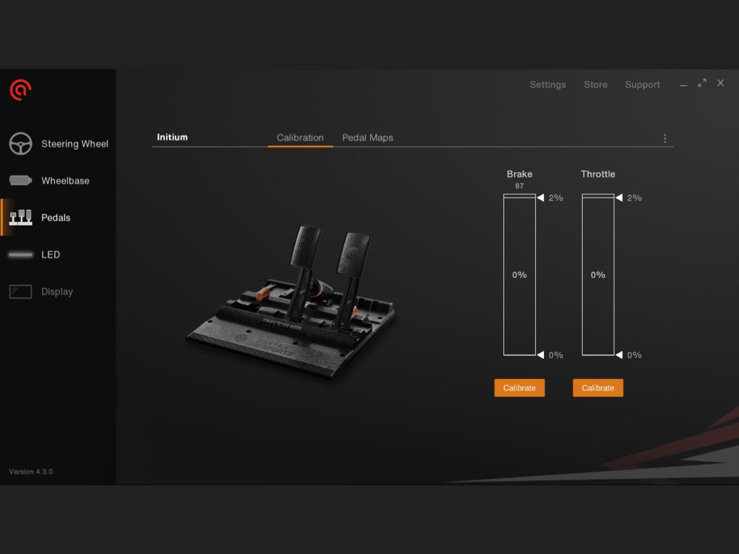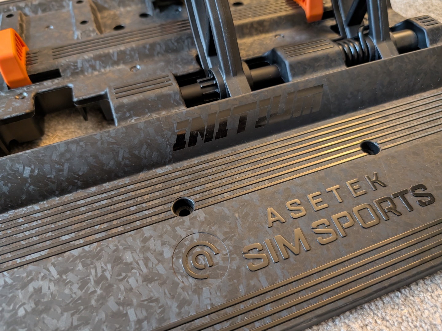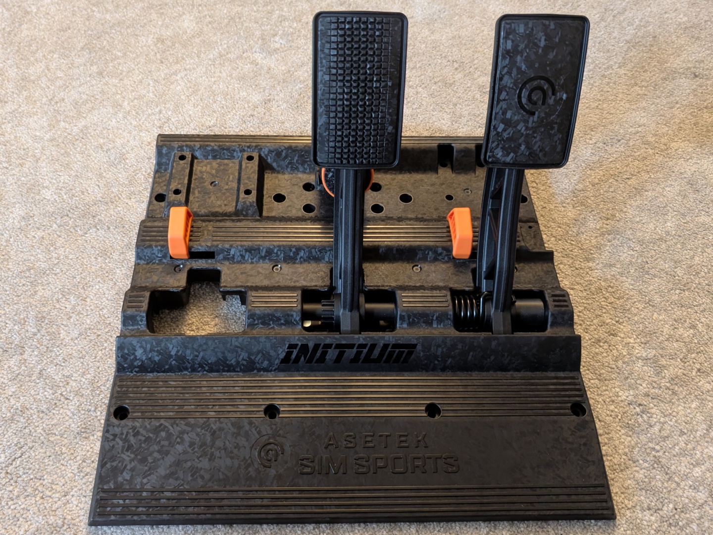 När det gäller pedalerna har Asetek tagit med sig sina lärdomar från premiumpaketen in i Initium-pedalsatsen. Det finns gas- och bromspedal med plats för en kopplingspedal. De använder båda Hall-sensorer för input och bromspedalen har en tvåstegs fjäderbelastad aktivering. Pedalerna har också ett "Cockpit"- och ett "Floor"-läge som gör det möjligt att ändra vinkeln på gas- och bromspedalen beroende på hur den används. Pedalsatsen är tillverkad av glasfiberförstärkt kompositmaterial och finishen ser riktigt bra ut.