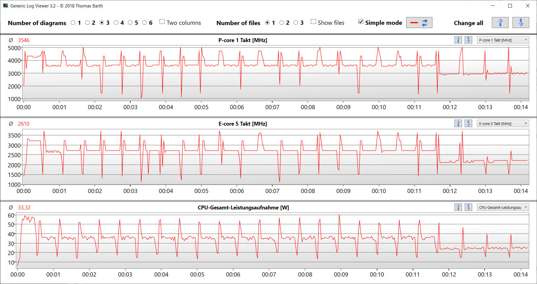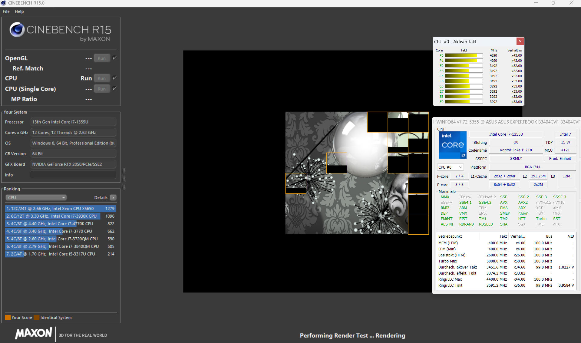 Core Core i7-1355Us 10 CPU-kärnor (2P, 8E) uppnår en maximal klockfrekvens på 5 GHz (P) och 3,7 GHz (E). Kontinuerlig flertrådsbelastning (CB15 Loop) gjorde att klockfrekvensen sjönk något från den första till den andra och igen från den tjugoförsta till den tjugoandra körningen. Därefter bibehölls en konstant nivå i varje fall. Vi noterade referensvärden över det tidigare CPU-genomsnittet (anslutet till elnätet). I batteriläge halverades både single-thread- och multi-thread-prestandan.