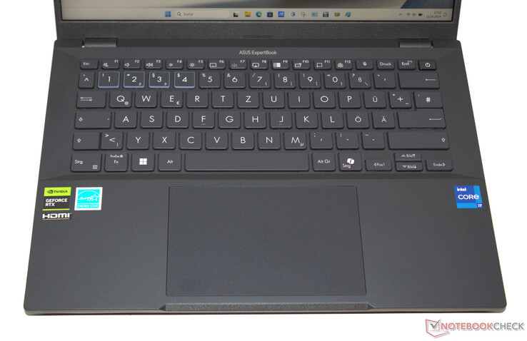 Chiclet-tangentbordets konkava tangenter (bakgrundsbelysning i en nivå, skyddade mot vattenstänk) har en medelhög lyftkraft och en tydlig tryckpunkt. I våra ögon skulle tangentmotståndet behöva vara lite mer skarpt. En liten eftergivlighet i tangentbordet visade sig inte vara ett problem för oss. Negativt: Piltangenterna och Enter-tangenten är lite på den lilla sidan. En multi-touch-aktiverad klickplatta (ca 13 x 8,2 cm) fungerar som en musersättning och den har en kort lyft och en tydlig tryckpunkt.