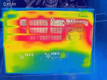 Under belastning (stresstest, Witcher 3 test) värms datorn inte upp särskilt mycket. Vi uppmätte ibland värden runt de nedre 40 graderna Celsius. Vid daglig användning (kontor, internet) ligger värdena kvar i den gröna zonen.