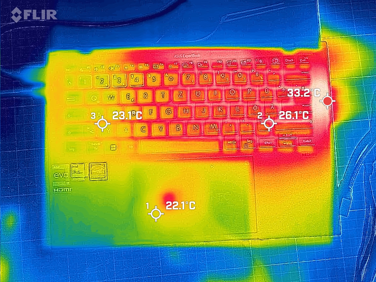 De uppmätta värdena i stresstestet är motsvarande höga och når nästan 60 °C på bottenplattan direkt ovanför SoC. Detta scenario motsvarar dock knappast typisk användning. Detta visar, till exempel i våra ihållande belastningstester för SSD, när man kör krävande riktmärken flera gånger eller spelar Witcher 3, ExpertBook B9 upprätthåller en stabil prestandanivå. Värmen avleds därför på ett tillförlitligt sätt utomhus.
