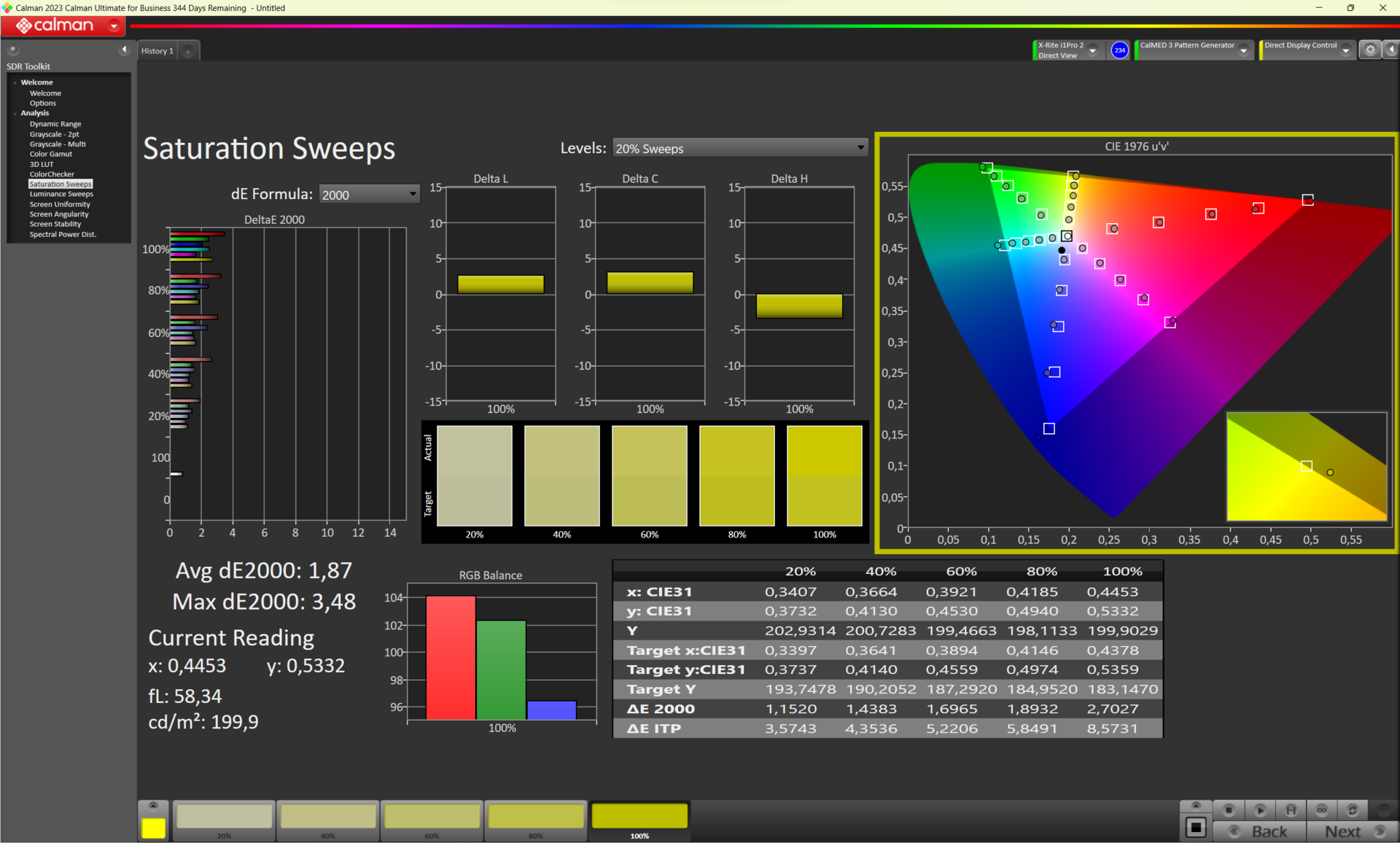 Färgåtergivningen är mycket exakt. Den genomsnittliga avvikelsen ligger under uppfattbarheten med ett DeltaE på 2,2. Endast i vissa röda och gula toner kommer erfarna ögon att upptäcka felaktigheter. I övrigt är skärmen mycket väljusterad från fabrik. En manuell kalibrering från vår sida resulterade inte i någon förbättring.