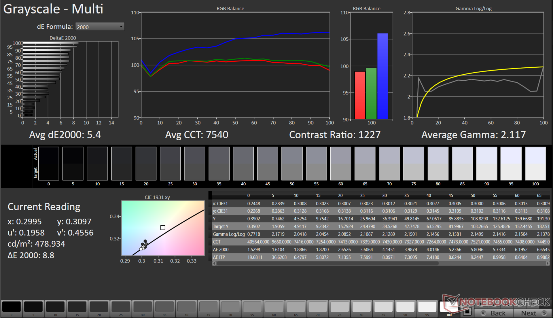 Vi uppmätte en maximal ljusstyrka på 473 nits med en bra 89% distribution och minimal genomblödning av ljus. Det uppmätta kontrastförhållandet på 1.231:1 ger en subjektivt bra tittarupplevelse.