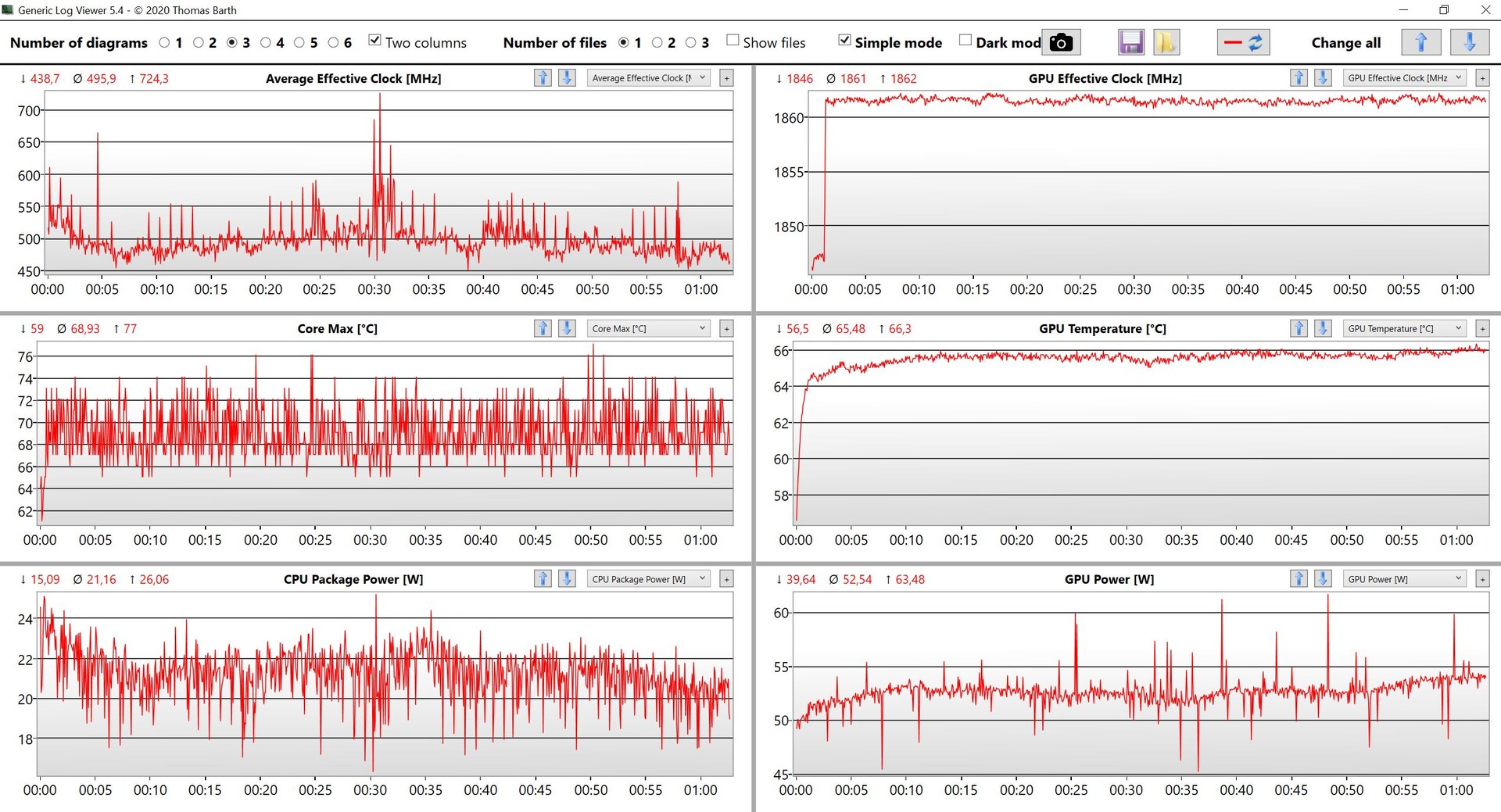 Prestandan under vårt stresstest är också bra. GPU:n bibehåller 45 watt och processorförbrukningen varierar mellan 30-50 watt. Dessa värden sjunker till 18 W för processorn och 26 W för GPU:n vid batteridrift. Vi märkte ingen prestandaförlust direkt efter stresstestet.