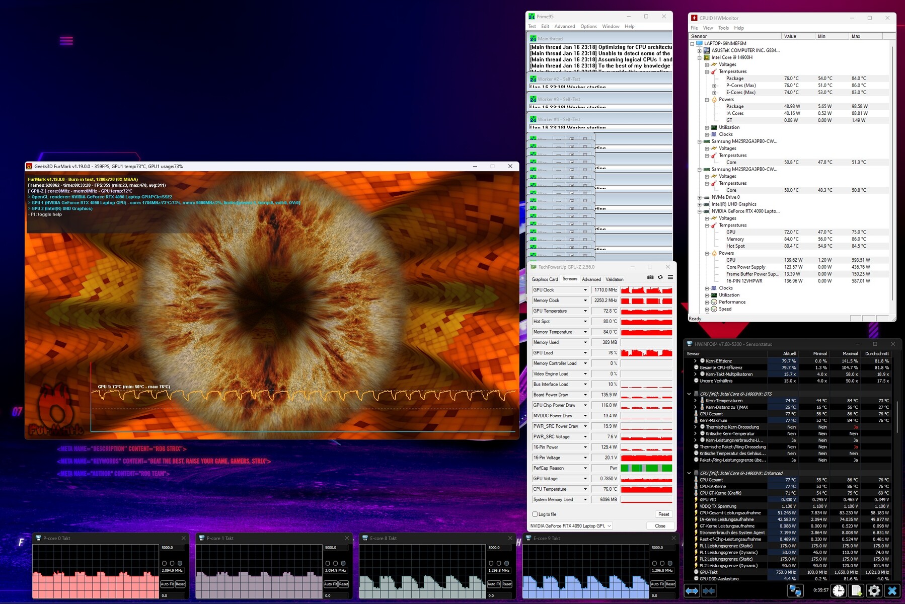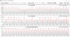 Stresstestet (med Prime95 och Furmark igång konstant) representerar ett extremt scenario för att utvärdera systemets stabilitet under full belastning. Processorn når maxhastigheter på 2,5 till 2,6 GHz (P-kärnor) och 2,2 till 2,3 GHz (E-kärnor). GPU:n (1,9 till 2 GHz) börjar testet med nästan full hastighet och hastigheten sjunker något när testet fortsätter. Dessutom stryps GPU: n regelbundet betydligt.