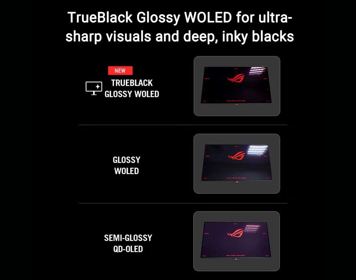 Specifikt använder ROG Swift OLED XG27AQWMG en TrueBlack Glossy-beläggning, som Asus hävdar ger skarpare bilder och djupare svarta även i väl upplysta rum. Färger tenderar också att poppa mer på glansiga skärmar jämfört med matta paneler. Utöver det säger Asus att TrueBlack Glossy-panelen minskar reflektioner med upp till 38% jämfört med WOLED-skärmar av tidigare generation. Med det sagt tillkännagav Gigabyte också MO27Q28GR med en liknande 280 Hz Tandem WOLED-panel och en RealBlack Glossy-beläggning, men den är ännu inte tillgänglig.