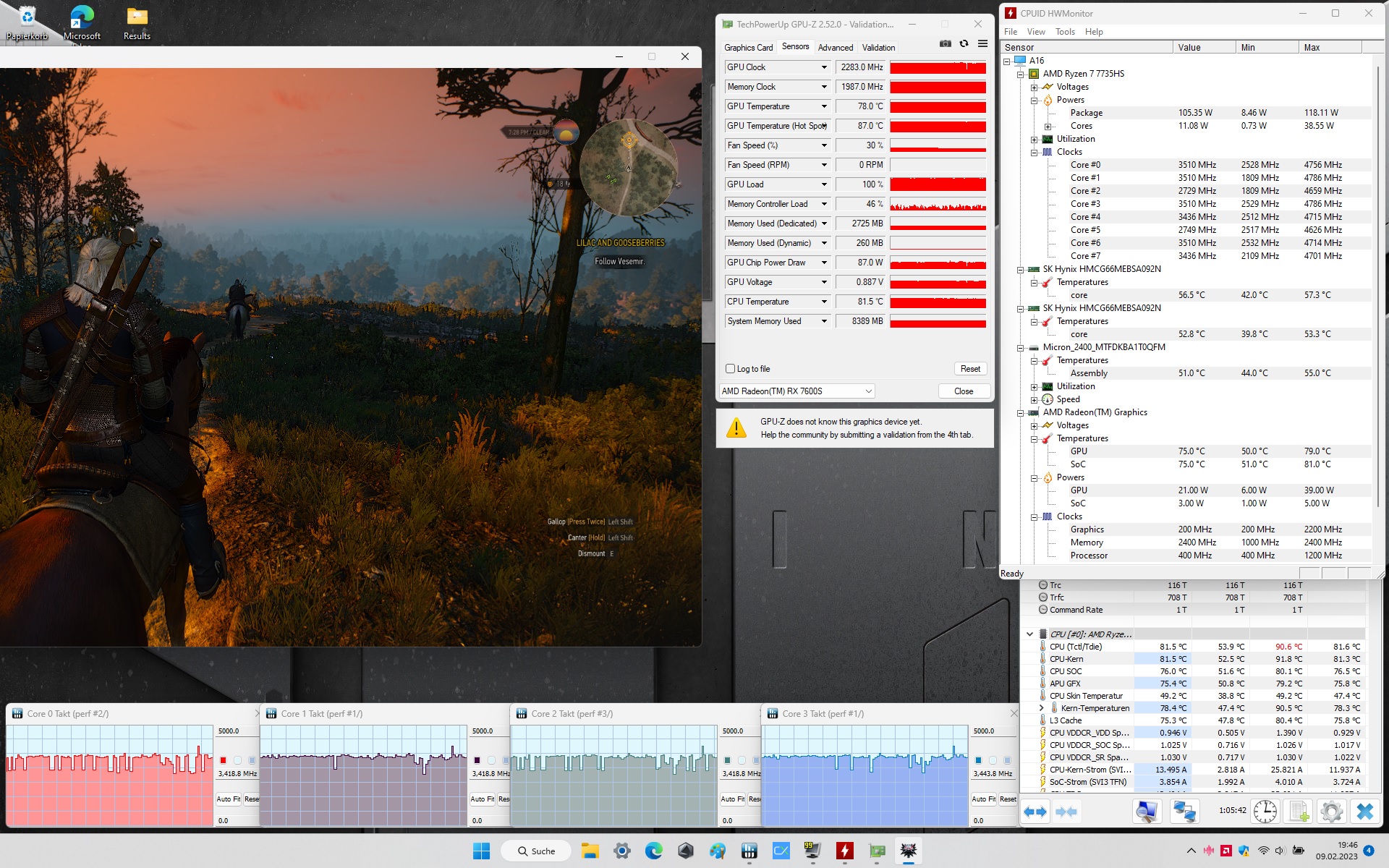 Det är inte så konstigt, eftersom komponenterna uppnår höga temperaturer under belastning. Efter 60 minuters stresstest med Furmark och Prime95 värmde processorn upp till över 90 °C (GPU: ca 80 °C). I The Witcher 3 förblev Ryzen 7 7735HS bara något svalare, omkring 80 °C (GPU återigen ca 80 °C).