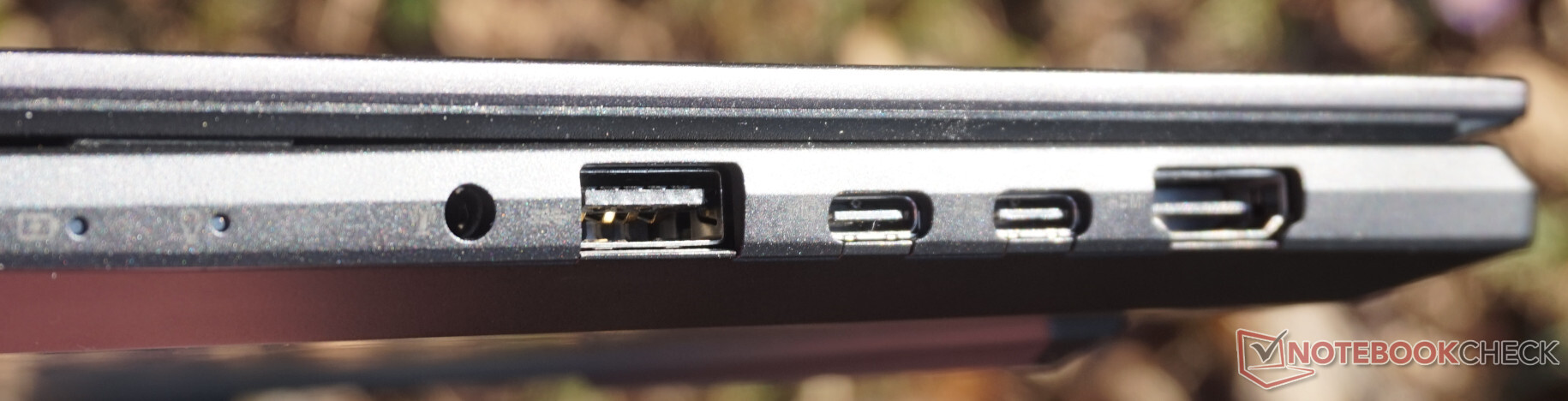 I/O-portarna till höger är ganska typiska för moderna enheter: det finns två USB-C-portar bredvid varandra så att åtminstone en av dem är tillgänglig när du använder den andra för laddning. Förutom att stödja Power Delivery kan båda portarna ge ut DisplayPort-signaler. Med det sagt är de inte särskilt snabba och kan bara nå hastigheter på 10 Gbit/s, vilket medför några begränsningar om du vill ansluta en extern SSD till den bärbara datorn. Men detta bör inte påverka prestandan när det gäller åtkomst till data.