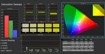 Enligt Asus är 100% DCI-P3 färgomfång en självklarhet, men våra mätningar resulterade i "bara" 99%. Färgrymden sRGB, å andra sidan, når 100% täckning och färgrymden AdobeRGB 95%. Enligt tillverkaren uppskattas skärmens ljusstyrka till i genomsnitt 400 nits. Vi uppmätte ett genomsnitt på 376 cd/m2 och ett maximum på 381 cd/m2, så vi kan inte helt bekräfta Asus påstående. Som vanligt för OLED-paneler är belysningen fördelad homogent till 98%.