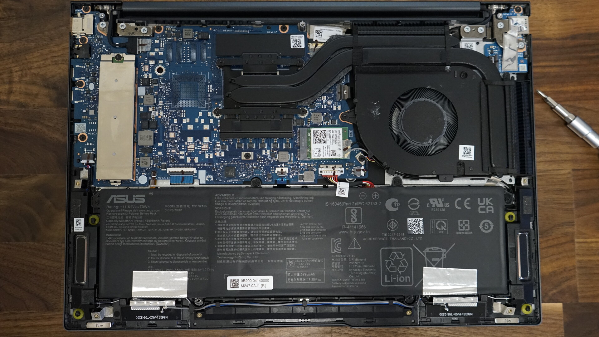 Att öppna ZenBook är relativt enkelt och endast nio lättåtkomliga skruvar behöver tas bort från undersidan. Wi-Fi-modulen, batteriet och SSD är utbytbara, medan RAM-minnet är lödd. Den interna strukturen avslöjar också skillnaden i kylning jämfört med föregångaren, eftersom endast en fläkt är installerad i 2023-modellen.