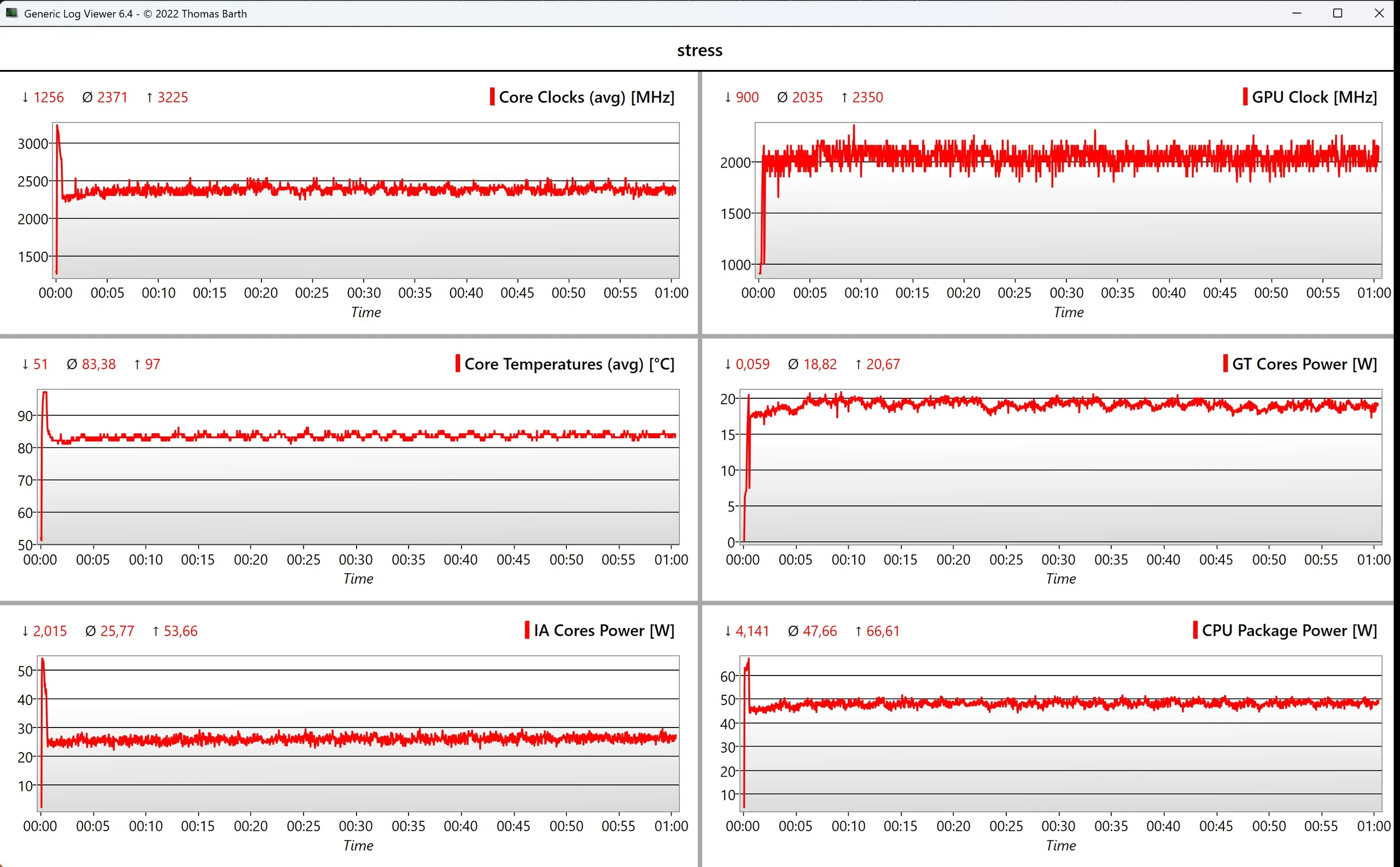 Under belastning kan vi se ett maximum på 96 watt, som sedan snabbt planar ut på 80 watt efter cirka 45 sekunder. Utanför EU levereras Zenbook Duo med ett 100-watts nätaggregat, vilket verkar tillräckligt kraftfullt.