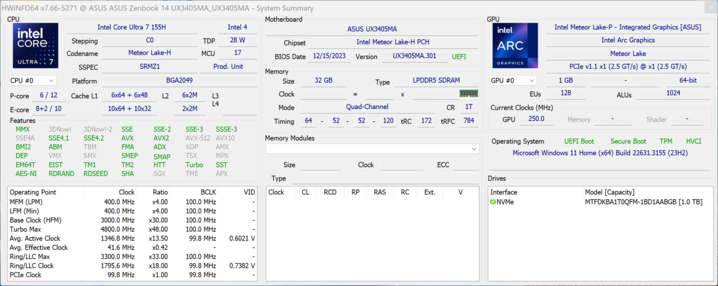 | Asus ZenBook 14 UX3405MA Ultra 7 155H, Arc 8-Core, Micron 2400 MTFDKBA1T0QFM, OLED, 2880x1800, 14" | Tuxedo Pulse 14 Gen3 R7 7840HS, Radeon 780M, Samsung SSD 980 Pro 2TB MZ-V8P2T0, IPS, 2880x1800, 14" | Acer Swift Go 14 SFG14-72 Ultra 7 155H, Arc 8-Core, SK hynix HFS001TEJ9X110NA, OLED, 2880x1800, 14" | Schenker Vision 14 2023 i7-13700H, Iris Xe G7 96EUs, Samsung 990 Pro 1 TB, IPS, 2880x1800, 14" | Dell XPS 13 Plus 9320 Core i7-1360P i7-1360P, Iris Xe G7 96EUs, Samsung PM9A1 MZVL2512HCJQ, OLED, 3456x2160, 13.4" | Apple MacBook Air M2 10C GPU M2, M2 10-Core GPU, Apple SSD AP1024Z, IPS, 2560x1664, 13.6" | Genomsnitt Intel Arc 8-Core iGPU | Genomsnitt av klass Subnotebook | |